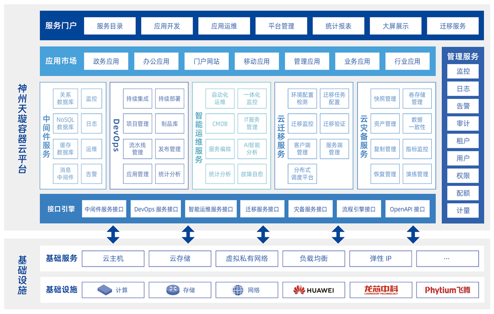 全栈自主可控的企业级容器云服务平台,,,,开箱即用的企业级多云管理、、业务迁移上云、、、、云上开发测试、、运维管理及容灾备份功能特性,,,模块化按需部署,,,降低建设成本,,随业务需求灵活扩展。。。。