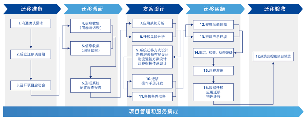 帮助客户进行数据中心的各类迁移服务,,包括传统数据中心及新一代云数据中心的 IT 基础设施设备迁移、、系统迁移、、、数据迁移、、、应用迁移、、同城灾备/双活、、、、异地容灾等各类场景迁移。。设备包含主机、、存储、、网络、、、服务器、、、云平台、、、数据库、、、中间件、、、、应用、、、、灾备系统等各类软硬件。。迁移服务通过制定迁移策略和计划,,,组织高效、、准确地执行迁移,,,,并在既定等停机窗口内完成数据中心的搬、、迁、、建、、、管、、、、谋等过程。。 一站式集成迁移服务能力:新一代数据中心规划、、、建设、、、优化、、容灾、、、迁移、、物流、、、、备件、、、、运维
