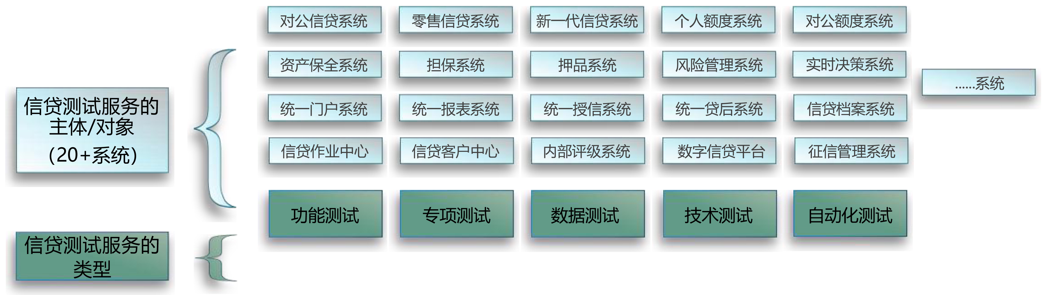 提供全面的测试服务,涵盖新信贷、、、、对公/零售信贷等20+信贷类系统,,,以及功能、、、性能、、数据、、、、自动化等类型测试。。。
