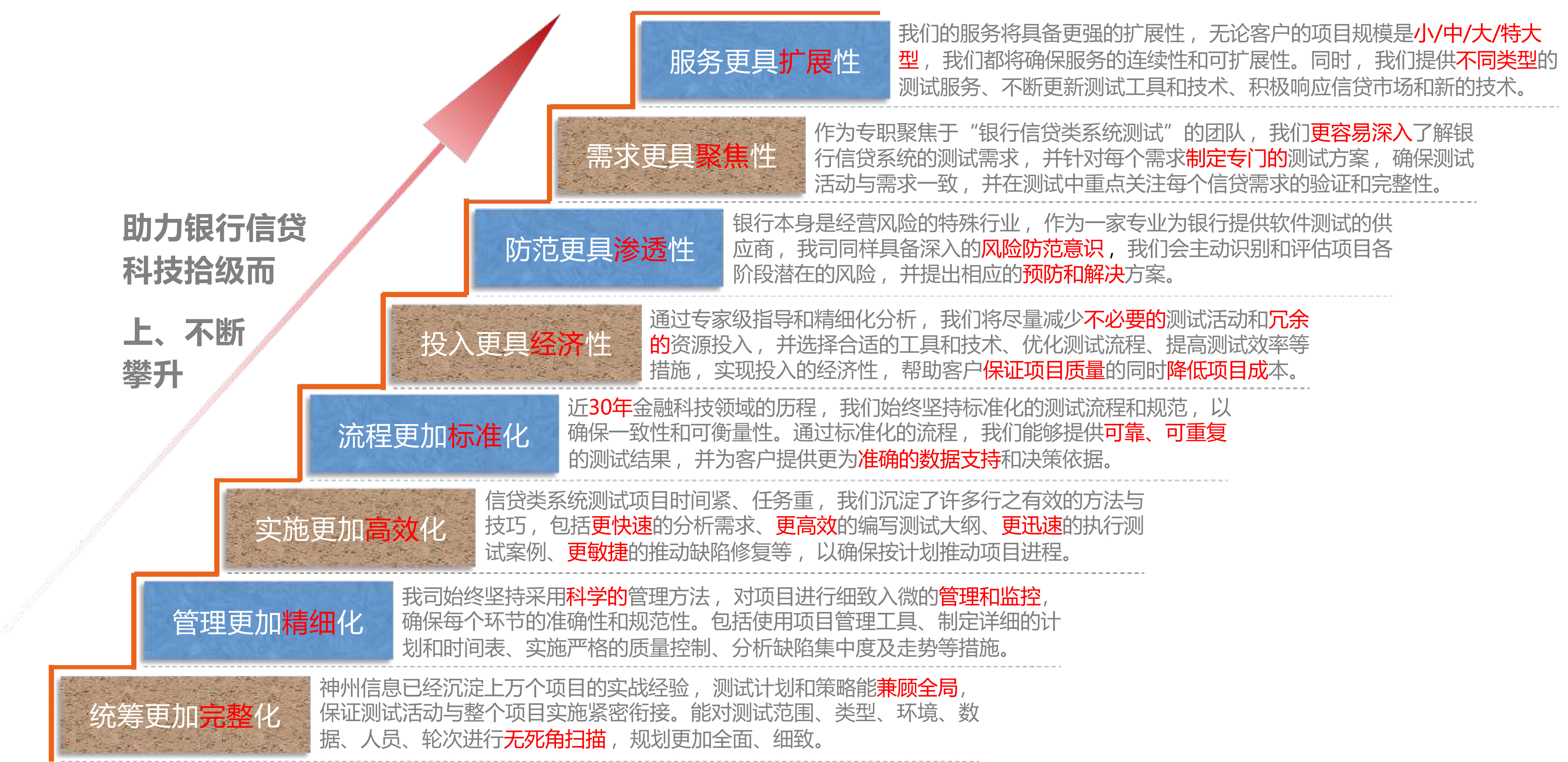 完善的测试管理体系,,及优质、、全面的测试服务,,,,以高标准监控项目实施各个阶段,,,确保信贷类系统测试项目得以高质量的完成。。